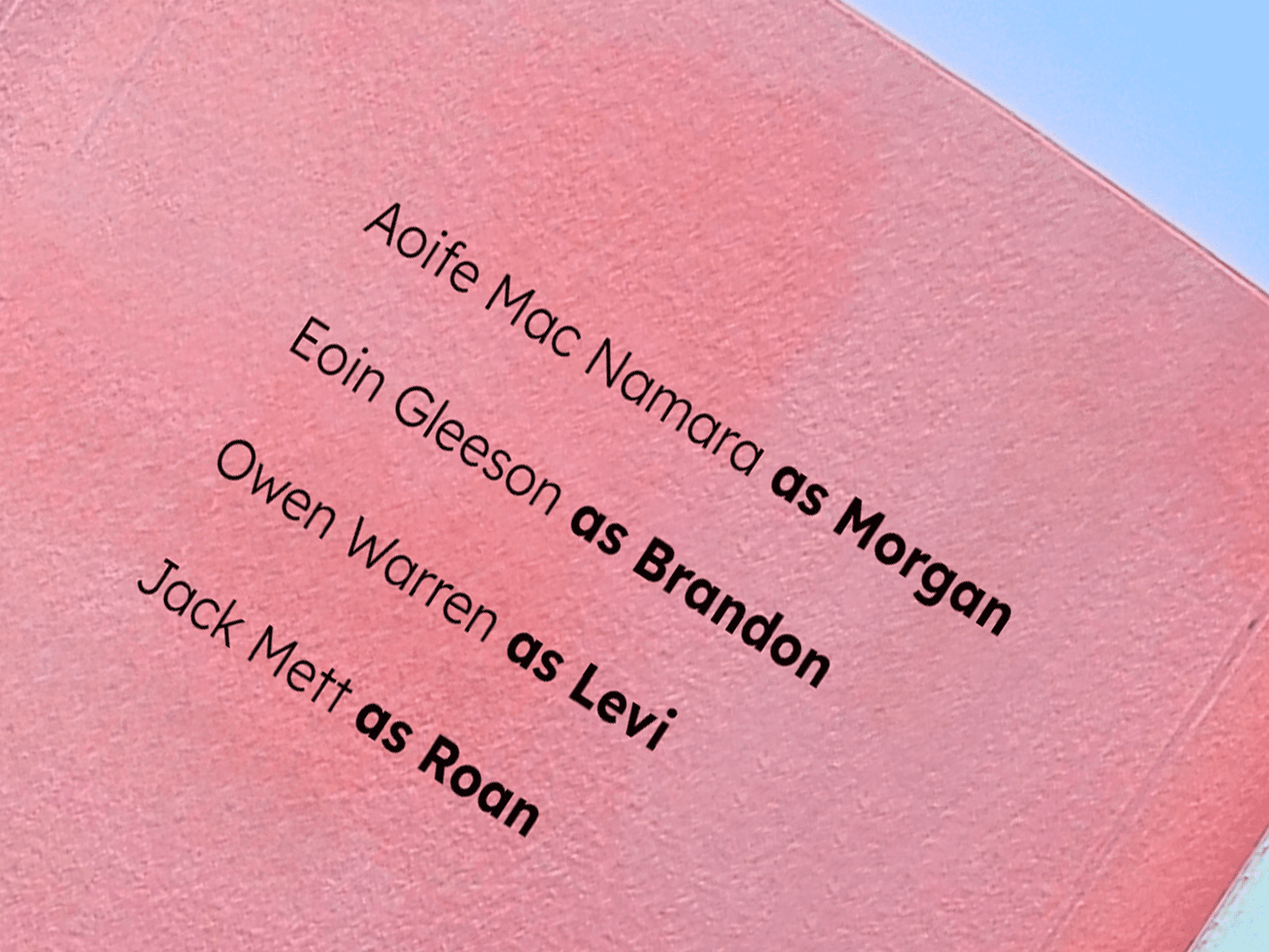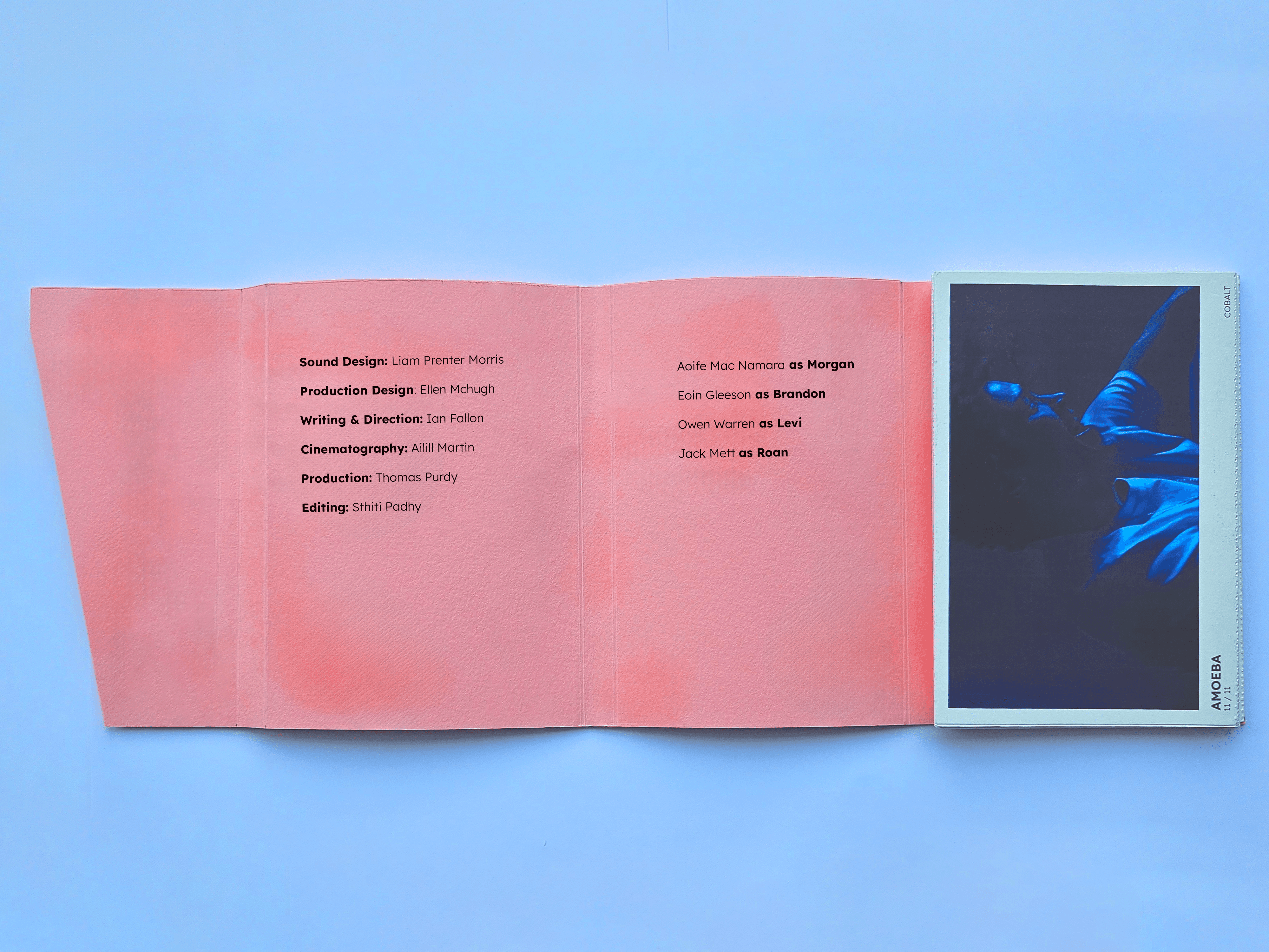 The final print artifact after iteration has an accordion style trail of postcards of 11 stills from the film. Encased in a pink softcover, Pink was chosen as a reference to the colour commonly chosen as the colour of a brain. This was also to reflect the romantic nature of the film. Credits for the cast and crew of the film were also included on the inside of the cover as an additional touch and spot like for the makers of the film.