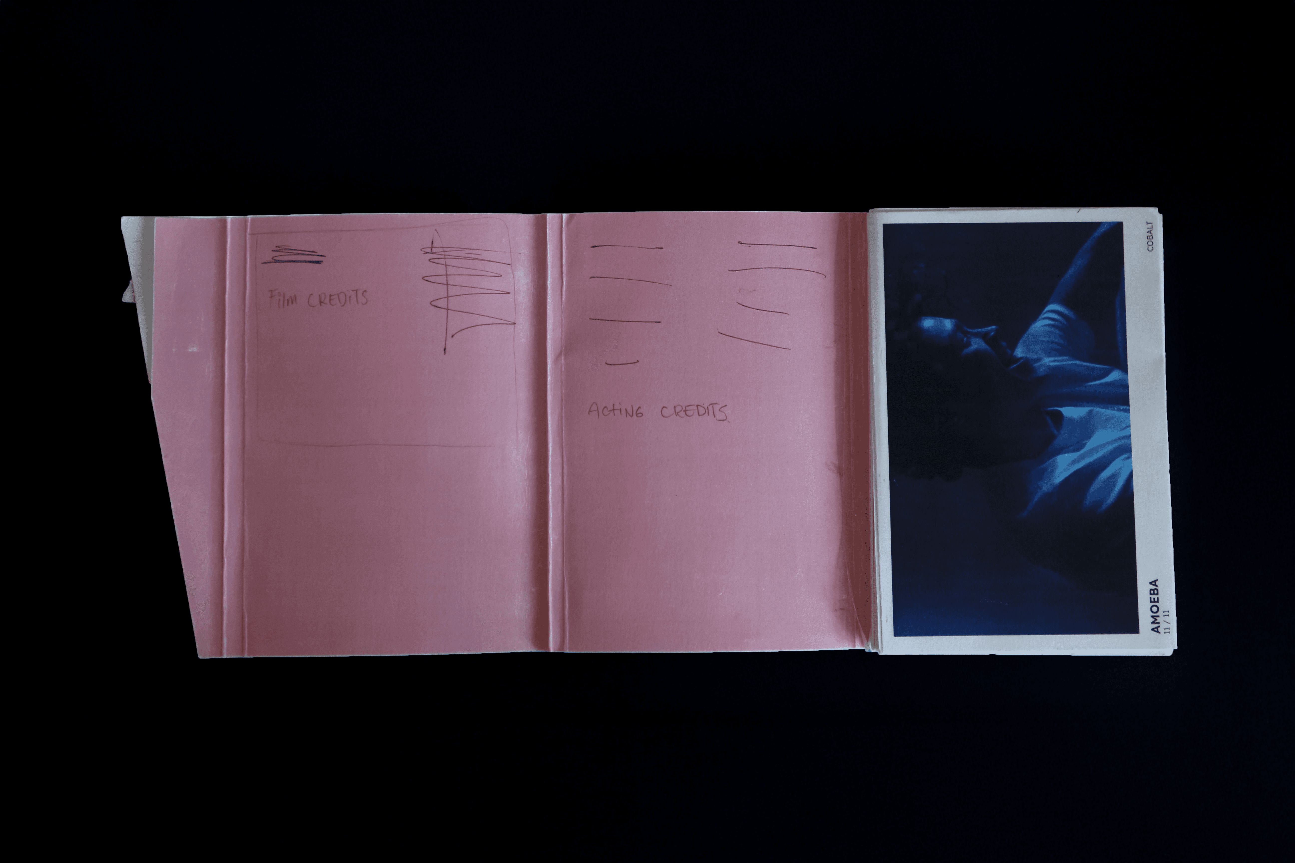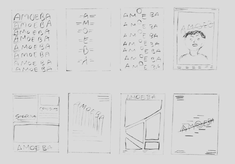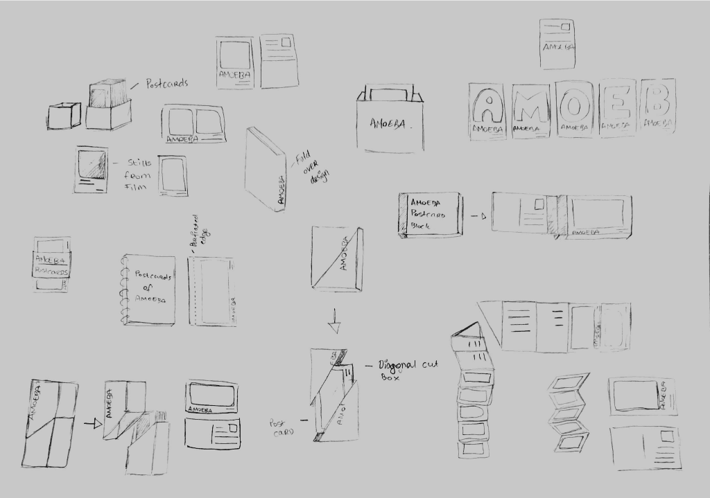 My first concept was to have a loose deck of these stills as postcards in a hardbox. Iterating on this postcard collection concept developed into the postcards being encased in an accordion style book block, the postcards which would have perforated joints so the cards could be torn apart and used individually each card showcases a still from the Amoeba film tied in more with the visuals of the Amoeba film itself which led me to make the choice.