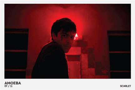The final sequence incorporates glitching like jump cuts, and interweaves slashing and shifting pieces of type and credits of the credits to echo the changing perspectives and perceived truths of Amoeba. The high contrast colours and tone also mirror these elements used in the film.
