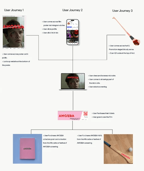The user has the possibility of coming across Amoeba promotion via social media, on posters or by the staged bloody scenes using blood stained hurls. Each promotion would carry a link or QR code directing the user to the microsite and calling them to view the film.