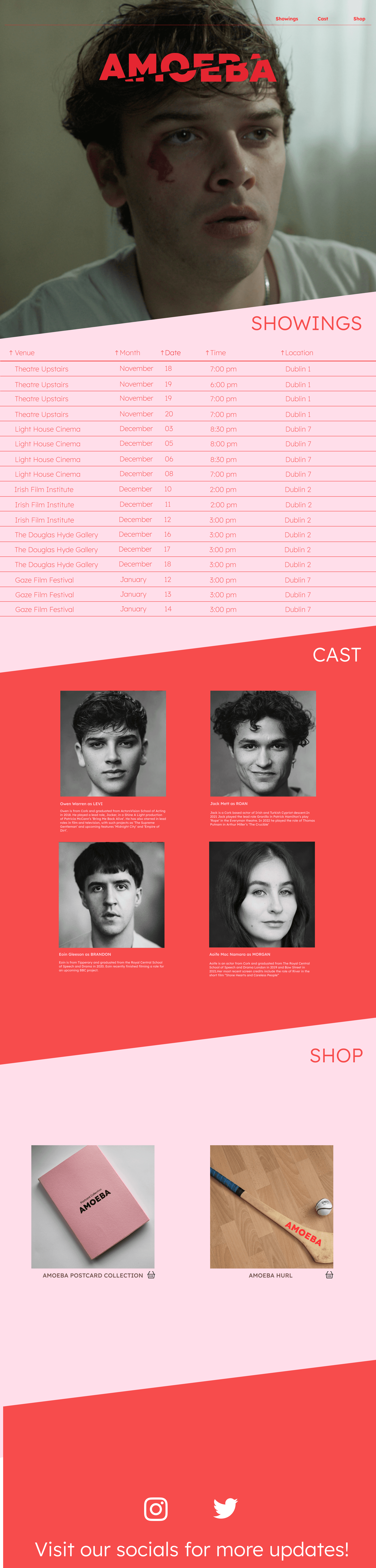 I designed the microsite to be the central up for a user to see the Amoeba film. Users who would come across Amoeba promotion would be directed to the site in order to buy tickets or purchase promotional material of the film as well as see shows and festivals the film would be at. I designed the microsite to reflect the visual language in the title sequence as well as the poster and artifact to create a visual link brand identity between the film and promotional material.